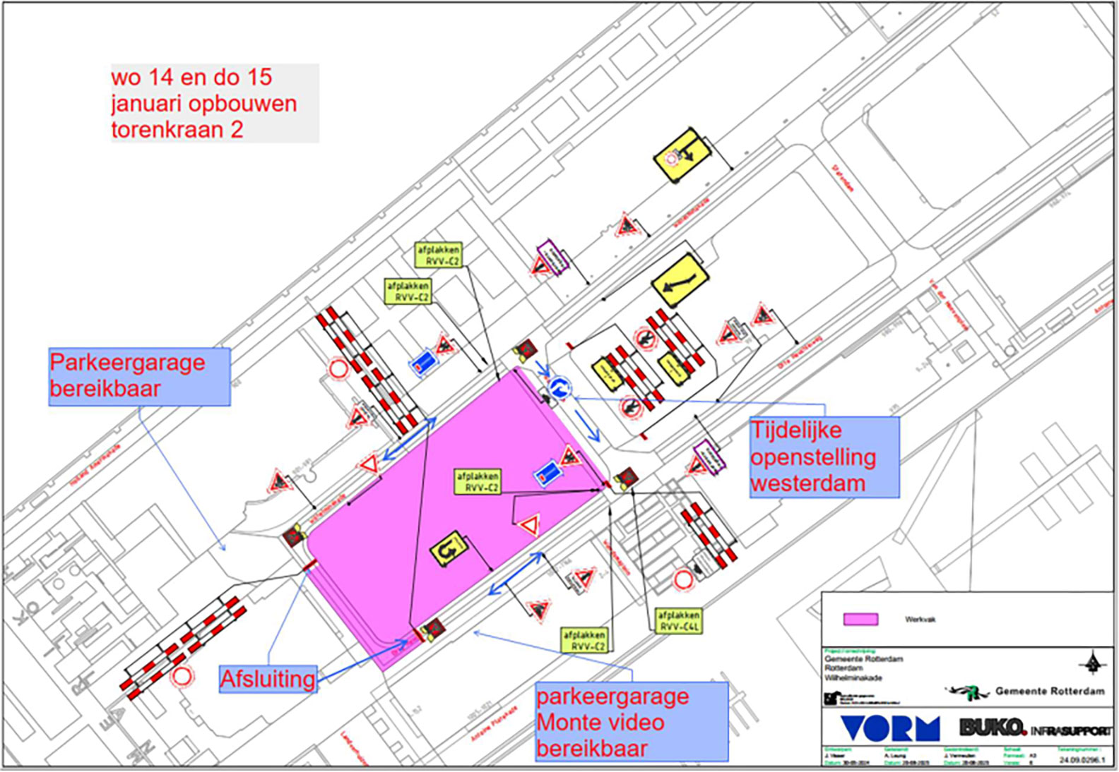 • De opbouw van torenkraan 2 op 14 en 15 januari. Dit is afhankelijk van het weer; bij slecht weer kan dit worden uitgesteld. Tijdens deze werkzaamheden wordt een deel van de weg tijdelijk afgesloten. In overleg blijft de parkeergarage bereikbaar en verkeersregelaars zijn aanwezig om alles in goede banen te leiden.